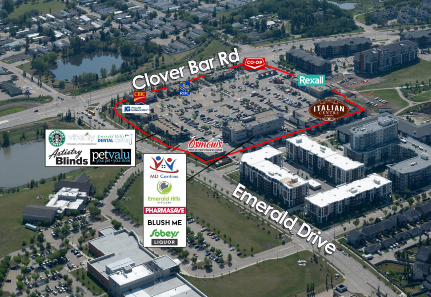 Emerald Hills Urban Village is a mixed-use commercial centre with fast food, financial services, a three-storey office/medical tower, and the popular Italian Centre grocery store, serving the affluent community of Sherwood Park and Strathcona County.